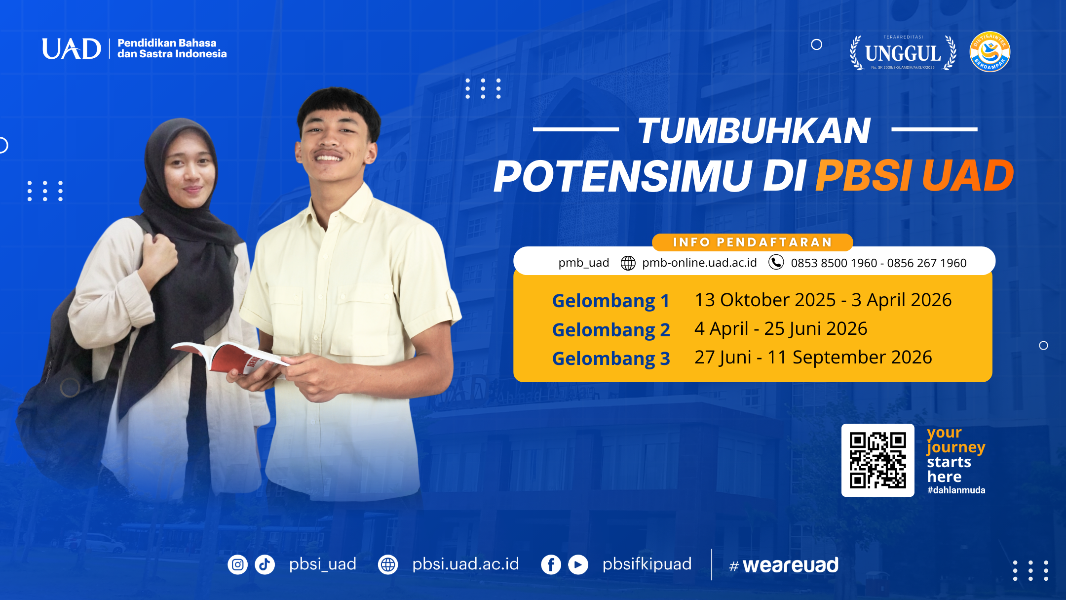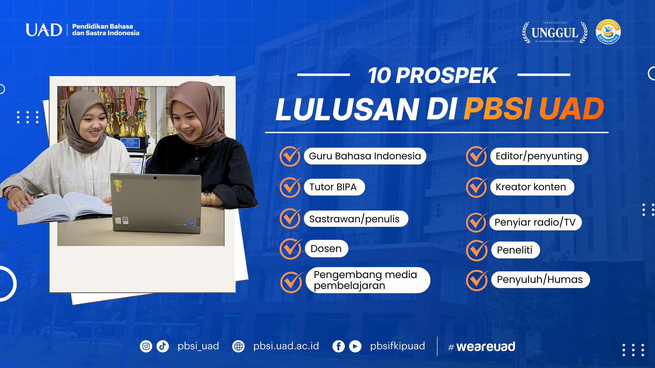 Program Studi Pendidikan Bahasa dan Sastra Indonesia Universitas Ahmad Dahlan (PBSI UAD) telah berperan aktif dalam membangun bangsa. Sepanjang perjalanan waktu, PBSI UAD terus bertransformasi menjadi program studi yang sigap dalam merespon perubahan zaman. Pada era Revolusi Industri 4.0 ini, PBSI UAD menempatkan diri sebagai lembaga yang siap mencetak lulusan yang berkompetensi dan sekaligus berkarakter. PBSI UAD menyusun kurikulum pendidikan yang selaras dengan perkembangan teknologi informasi (TI) dan nilai-nilai Islam. Dengan bekal tersebut, PBSI UAD optimis dapat mencetak lulusan yang mampu berkompetisi dengan tantangan zaman.