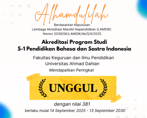 Program Studi Pendidikan Bahasa dan Sastra Indonesia Universitas Ahmad Dahlan (PBSI UAD) telah berperan aktif dalam membangun bangsa. Sepanjang perjalanan waktu, PBSI UAD terus bertransformasi menjadi program studi yang sigap dalam merespon perubahan zaman. Pada era Revolusi Industri 4.0 ini, PBSI UAD menempatkan diri sebagai lembaga yang siap mencetak lulusan yang berkompetensi dan sekaligus berkarakter. PBSI UAD menyusun kurikulum pendidikan yang selaras dengan perkembangan teknologi informasi (TI) dan nilai-nilai Islam. Dengan bekal tersebut, PBSI UAD optimis dapat mencetak lulusan yang mampu berkompetisi dengan tantangan zaman.