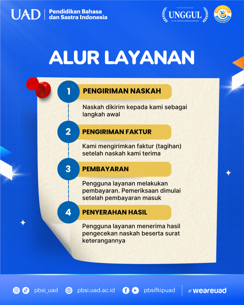 Perbaiki kualitas tulisan Anda dengan peninjauan menyeluruh oleh tim PBSI UAD. Layanan mencakup pengecekan typo, ejaan (EYD V), tanda baca, konjungsi, spasi ganda, kalimat efektif, hingga pengaturan paragraf agar naskah lebih rapi dan sesuai kaidah.