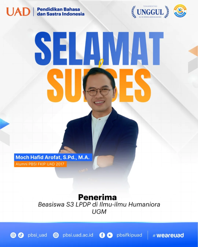 YOGYAKARTA — Kabar membanggakan datang dari alumni Program Studi Pendidikan Bahasa dan Sastra Indonesia (PBSI) FKIP Universitas Ahmad Dahlan. Moch Hafid Arofat, S.Pd., M.A., alumni PBSI UAD tahun 2017, berhasil meraih Beasiswa S3 dari LPDP untuk melanjutkan studi pada bidang Ilmu-ilmu Humaniora di Universitas Gadjah Mada.