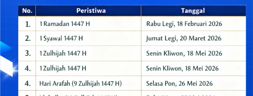 /in Pengumuman /by Arif SetiawanBerdasarkan Maklumat Pimpinan Pusat Muhammadiyah Nomor 02/2025 tentang Penetapan Hasil Hisab Ramadan, Syawal, dan Zulhijah 1447 Hijriah, Pimpinan Pusat Muhammadiyah telah menetapkan awal Ramadan, Syawal, dan Zulhijah 1447 H sesuai hasil hisab yang dilakukan oleh Majelis Tarjih dan Tajdid.