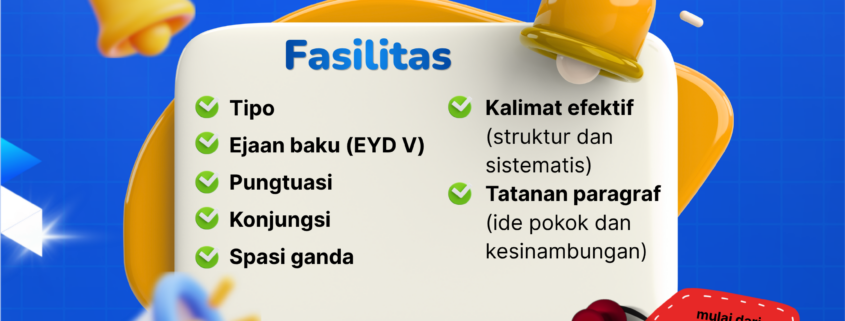 Perbaiki kualitas tulisan Anda dengan peninjauan menyeluruh oleh tim PBSI UAD. Layanan mencakup pengecekan typo, ejaan (EYD V), tanda baca, konjungsi, spasi ganda, kalimat efektif, hingga pengaturan paragraf agar naskah lebih rapi dan sesuai kaidah.