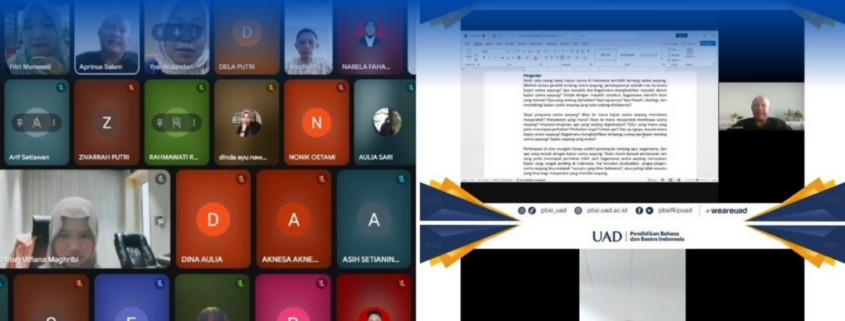 Acara yang digelar secara daring melalui Google Meet pada Jumat (18/7) pukul 13.30 WIB ini disambut hangat oleh para dosen dan mahasiswa. Dalam sambutannya, Wachid Eko Purwanto, S.Pd., M.A., selaku dosen PBSI UAD, menyampaikan rasa hormat dan kebanggaannya atas kehadiran Prof. Aprinus. “Beliau adalah guru kami saat kuliah di UGM. Kami menyebut beliau mbah guru karena peran pentingnya dalam perjalanan akademik kami,” ujar Wachid. Ia juga menambahkan bahwa kata “kami” merujuk pada beberapa dosen PBSI UAD, yakni dirinya bersama Yosi, Fitri, dan Ardi, yang pernah menjadi mahasiswa Prof. Aprinus semasa studi di UGM.