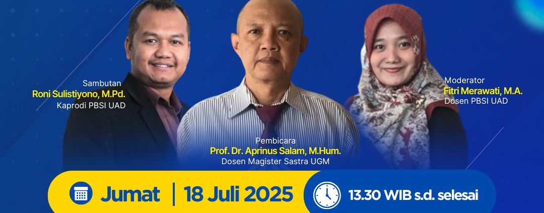 Yogyakarta, 18 Juli 2025 — Program Studi Pendidikan Bahasa dan Sastra Indonesia (PBSI) Universitas Ahmad Dahlan (UAD) kembali menggelar kuliah umum bertema budaya dan kesusastraan. Kali ini, kuliah umum mengangkat tema Sastra Wayang, dengan menghadirkan narasumber terkemuka, Prof. Dr. Aprinus Salam, S.S., M.Hum., dosen Magister Sastra Universitas Gadjah Mada (UGM).