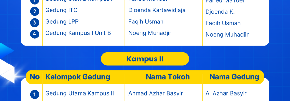 Universitas Ahmad Dahlan (UAD) tidak sekadar membangun ruang fisik, tetapi juga merawat nilai dan sejarah melalui penamaan gedung-gedungnya. Setiap gedung di Kampus I hingga VI UAD diberi nama tokoh-tokoh inspiratif yang berjasa dalam dunia pendidikan, dakwah, dan kebangsaan. Penamaan ini menjadi pengingat identitas, nilai perjuangan, dan teladan moral bagi sivitas akademika.