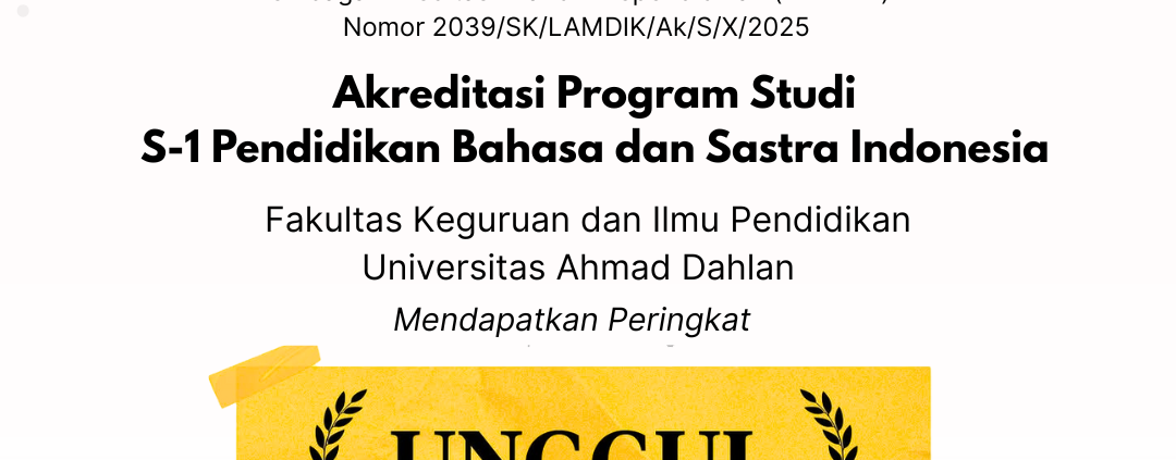 /in Berita, Prestasi Mahasiswa /by Arif SetiawanYogyakarta, 29 Oktober 2025 — Program Studi Pendidikan Bahasa dan Sastra Indonesia (PBSI), Fakultas Keguruan dan Ilmu Pendidikan (FKIP) Universitas Ahmad Dahlan (UAD) kembali menorehkan prestasi membanggakan. Berdasarkan Keputusan Lembaga Akreditasi Mandiri Kependidikan (LAMDIK) Nomor 2039/SK/LAMDIK/Ak/S/X/2025, PBSI FKIP UAD resmi meraih peringkat akreditasi Unggul dengan nilai 3.81.