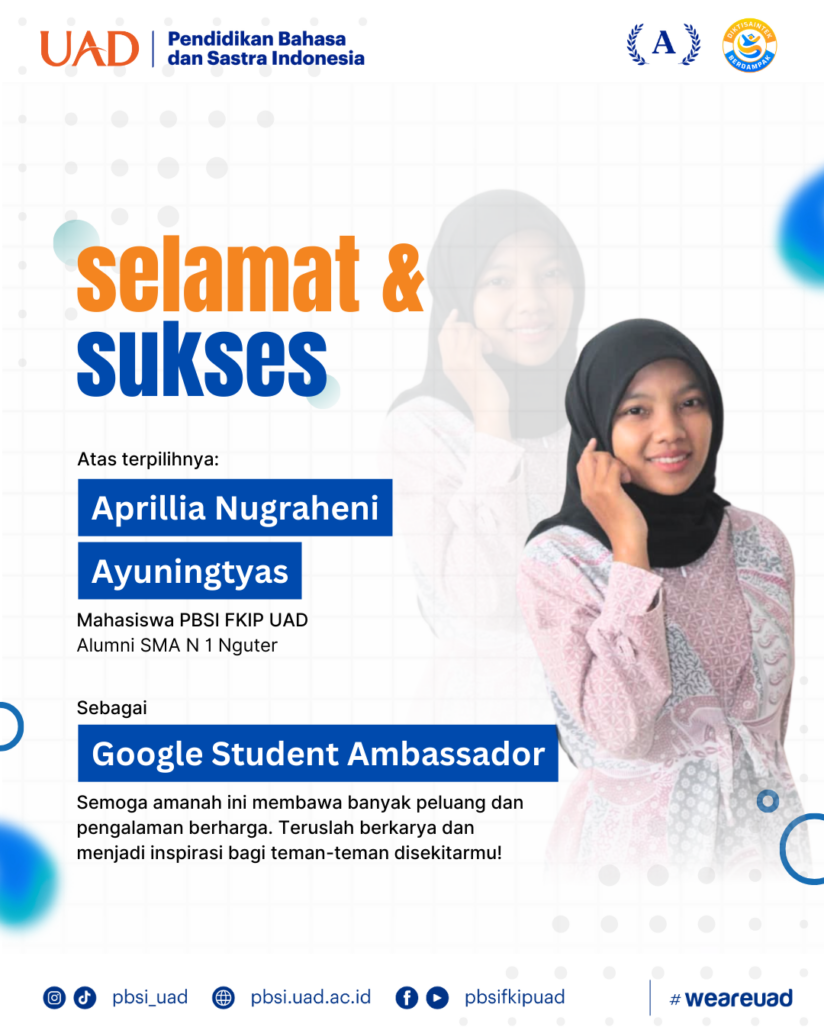 Yogyakarta, 20 September 2025– Prestasi membanggakan kembali diraih oleh Program Studi Pendidikan Bahasa dan Sastra Indonesia (PBSI), Fakultas Keguruan dan Ilmu Pendidikan (FKIP) Universitas Ahmad Dahlan (UAD). Salah satu mahasiswinya, Aprillia Nugraheni Ayuningtyas, berhasil terpilih sebagai Google Student Ambassador.
