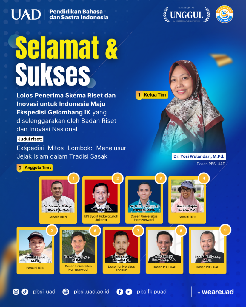 Yogyakarta (25/11)— Prestasi membanggakan kembali diraih sivitas akademika Program Studi Pendidikan Bahasa dan Sastra Indonesia (PBSI) Universitas Ahmad Dahlan. Dr. Yosi Wulandari, M.Pd., dosen PBSI UAD, bersama tim penelitinya berhasil lolos sebagai Penerima Skema Riset dan Inovasi untuk Indonesia Maju – Ekspedisi Gelombang IX yang diselenggarakan oleh Badan Riset dan Inovasi Nasional (BRIN).