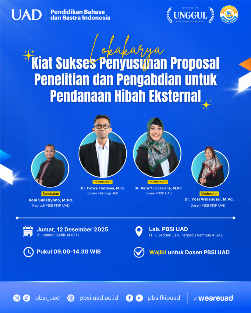 ✨ PBSI FKIP UAD menghadirkan Lokakarya Kiat Sukses Penyusunan Proposal Penelitian dan Pengabdian untuk Pendanaan Hibah Eksternal.