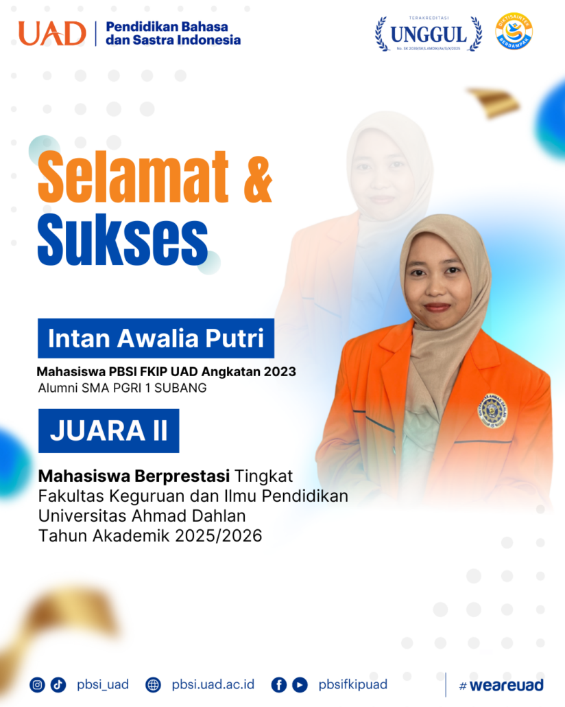 Yogyakarta (1/12) — Program Studi Pendidikan Bahasa dan Sastra Indonesia (PBSI) Fakultas Keguruan dan Ilmu Pendidikan Universitas Ahmad Dahlan (FKIP UAD) kembali mencatat prestasi membanggakan. Intan Awalia Putri, mahasiswa PBSI angkatan 2023 dan alumni SMA PGRI 1 Subang, berhasil meraih Juara II dalam ajang Mahasiswa Berprestasi (Mawapres) Tingkat FKIP UAD Tahun Akademik 2025/2026.
