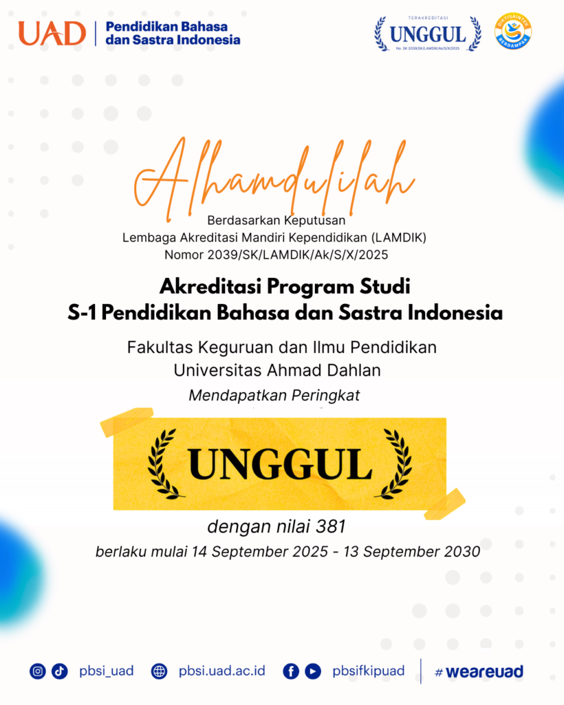 Yogyakarta, 29 Oktober 2025 — Program Studi Pendidikan Bahasa dan Sastra Indonesia (PBSI), Fakultas Keguruan dan Ilmu Pendidikan (FKIP) Universitas Ahmad Dahlan (UAD) kembali menorehkan prestasi membanggakan. Berdasarkan Keputusan Lembaga Akreditasi Mandiri Kependidikan (LAMDIK) Nomor 2039/SK/LAMDIK/Ak/S/X/2025, PBSI FKIP UAD resmi meraih peringkat akreditasi Unggul dengan nilai 3.81.